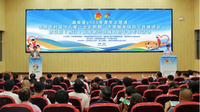 湖南省2025年青年志愿者关爱农村留守儿童“七彩假期”志愿服务项目工作推进会暨益阳(桃江)关爱新兴领域人员子女专项活动现场。
