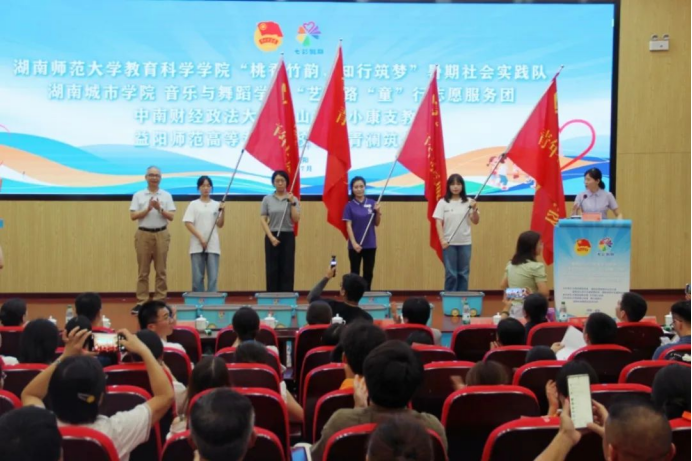 会上,“七彩假期”志愿服务对象新兴领域子女代表、益阳市蚂蚁社会工作服务中心和南县南山村志愿服务队代表分别讲述自己的“七彩假期”故事。会上还发布了2025年“七彩假期”省级入围团队名单,636支志愿服务团队入围省级志愿服务团队。现场为“七彩假期”志愿服务团队代表授旗、发放工具包,开展2025年“七彩假期”志愿服务项目培训会。部分与会人员代表前往桃江高新区、石牛江镇完全小学、石牛江镇牛剑桥村实地观摩“七彩假期”志愿服务开展情况。