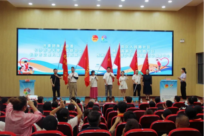 现场为“七彩假期”青年志愿服务队代表授旗、发放工具包